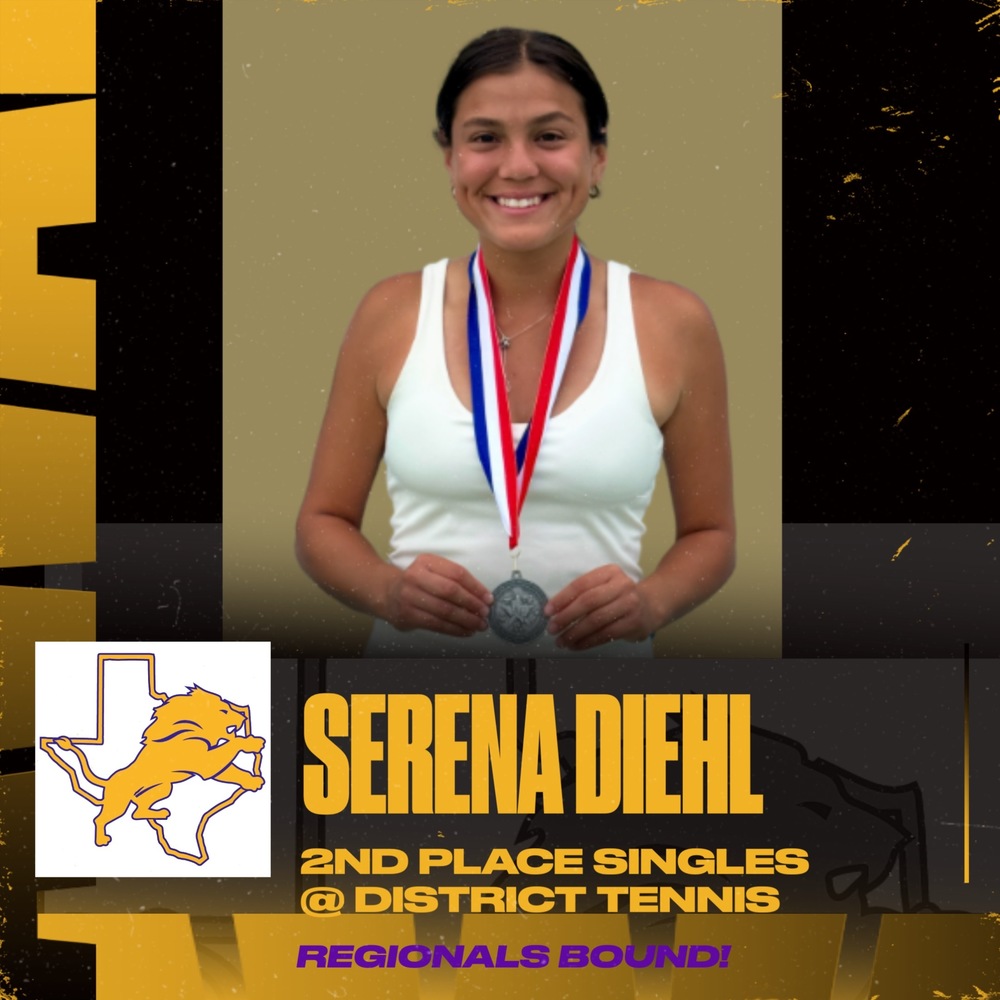 Serena Diehl placed 2nd in Girls Singles at District Tennis. Serena will be competing at Regional Tennis May 7-8 in Amarillo.